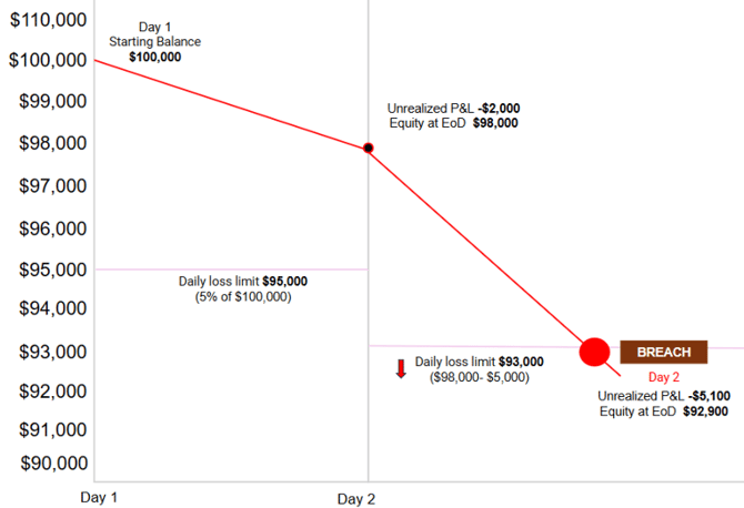 - Equity on the account drops to: $92,900 and this is below the Daily Loss Trigger level and the account is breached.