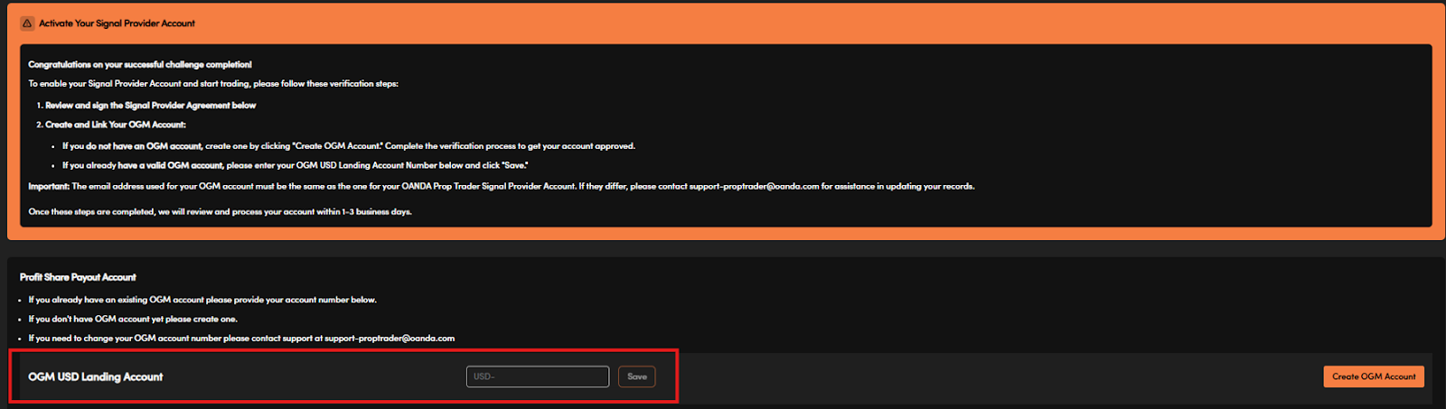 สำคัญ: ที่อยู่อีเมลที่ใช้สำหรับบัญชี OGM ของคุณจะต้องเหมือนกับที่ใช้สำหรับบัญชี OANDA Prop Trader Signal Provider ของคุณ หากแตกต่างกัน โปรดติดต่อ support-proptrader@oanda.com เพื่อขอความช่วยเหลือในการอัปเดตบันทึกของคุณ