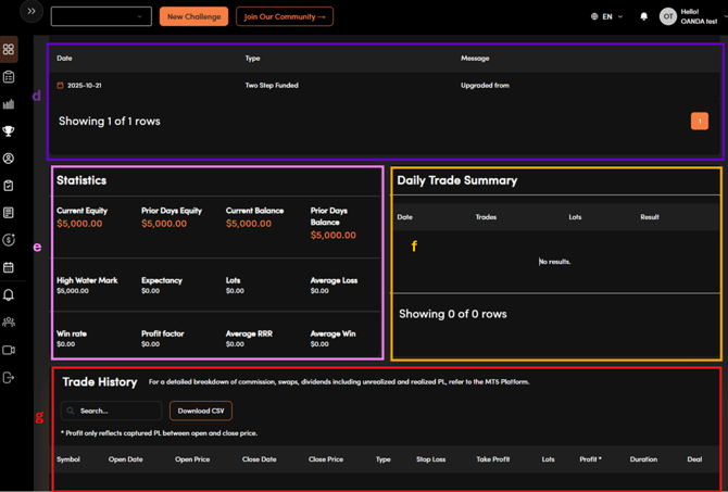 - Notifications - this section will inform you if your account has been upgraded or if you have reached your profit target