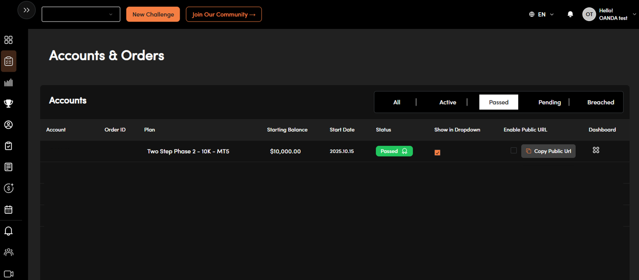 您將能夠查看所有帳戶、訂單、起始餘額、開始日期和狀態。