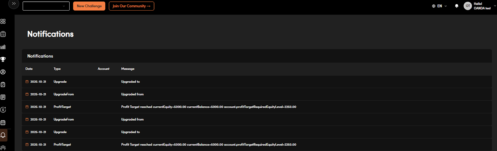 您可以在此部分查看與您的帳戶相關的所有通知。通知內容包括帳戶升級、違規原因和利潤目標等。