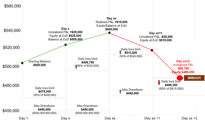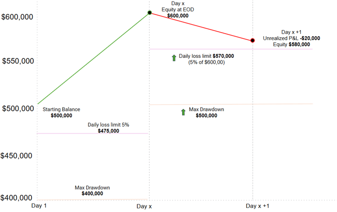 ขีดจำกัด Drawdown สูงสุด: $490,000 ($540,000 - $50,000 (10% ของยอดคงเหลือเริ่มต้น $500,000)) ระดับ Drawdown สูงสุดจะไม่ติดตามเพิ่มขึ้นระหว่างวัน และไม่ลดลง แต่จะคงอยู่ที่ระดับเดียวกับที่ถึงจากมูลค่า High Water Mark สูงสุด