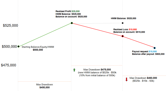 ขีดจำกัด Drawdown สูงสุด: $450,000 (คงที่, เนื่องจากกำไรยังไม่ถูกรับรู้, HWM ไม่มีการอัปเดต)