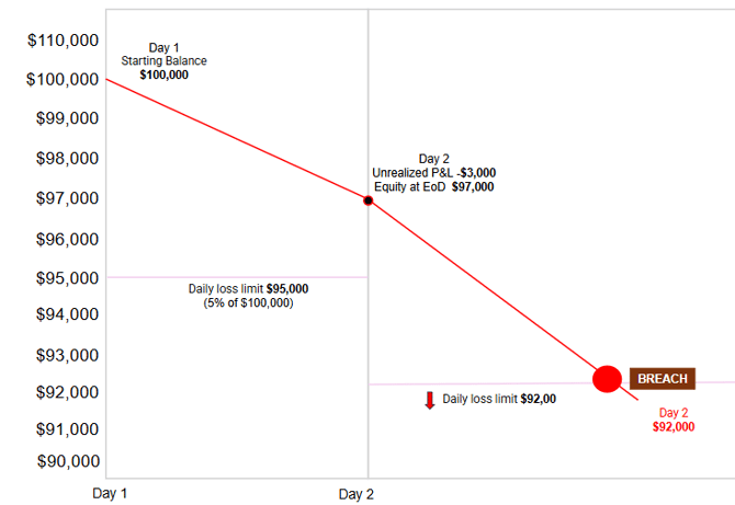 - Max daily loss amount: $5,000 ($100,000 * 5%)