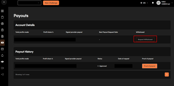 如果您有可用的利潤分成,可以透過儀表板中的「出金」選項卡提交請求。